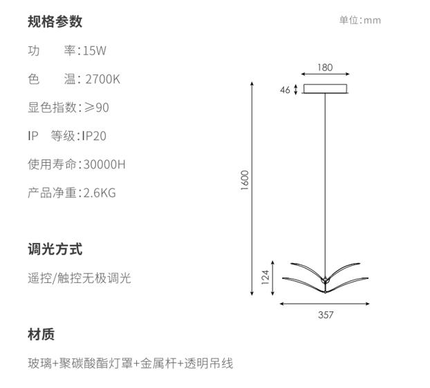 如翼吊灯用双层弯曲的造型作为主要造型特征形成在空间里自由灵动的造型,,,以一定的角度倾斜,,,形成丰富的画面,,,两翼的线条均为精心设计,,,,精准控制光线的传播,,,将直下光和漫反射光结合,,,70%灯光向下,,,30%灯光向上,,,在空间里形成舒适的光学效果,,,下灯罩为片状玻璃印刷专门调制的乳白色油墨,,热弯成对应弧度,,,灯光透过灯罩呈现出更加柔和的视觉效果;边缘特意留有5mm宽度透明环,,,,使视觉更精致轻巧;灯罩利用两个金属“领夹”式的杆连接固定,,,,整体视觉优雅;