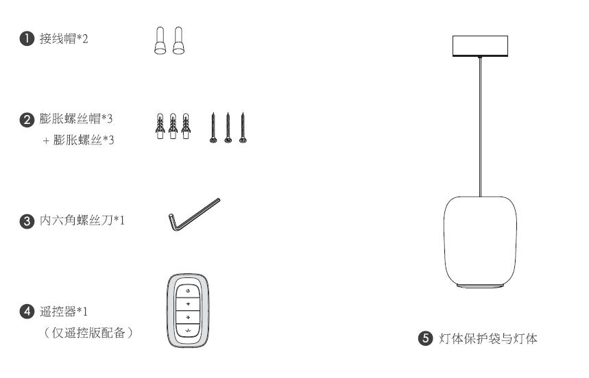 膨胀螺丝帽*3;膨胀螺丝*;接线帽*2 遥控器*1(遥控版本);内六角螺丝刀*1灯体*1;
